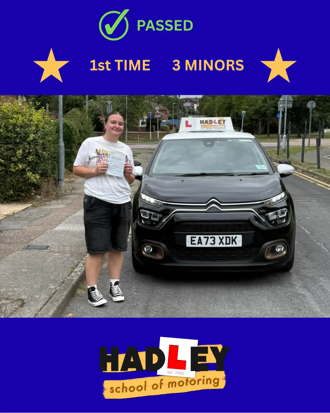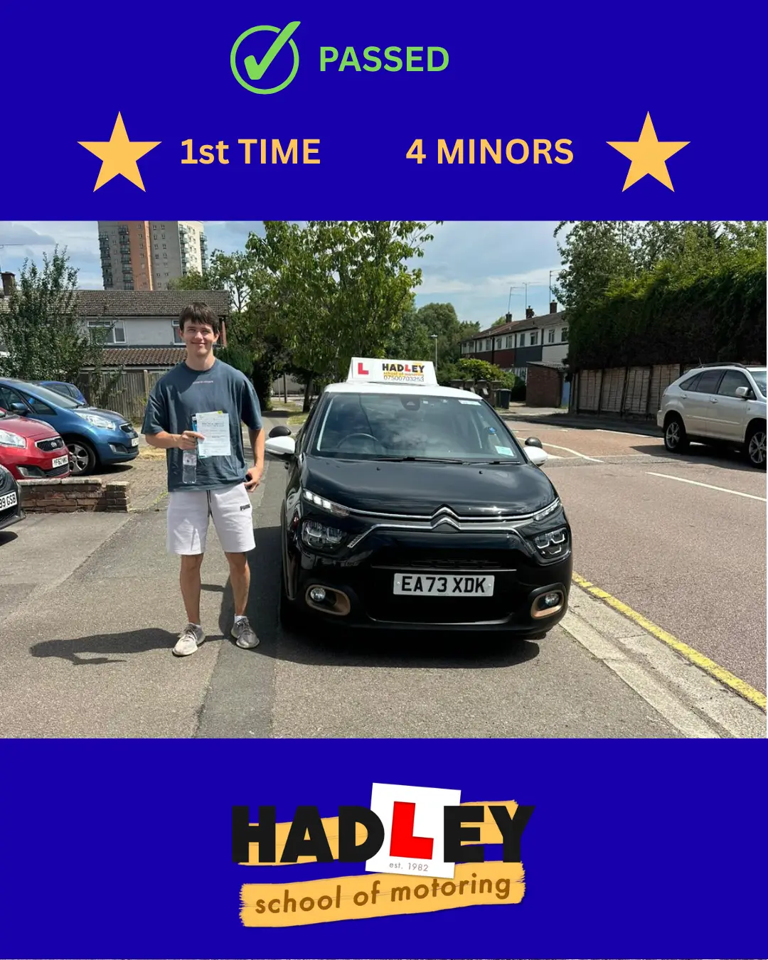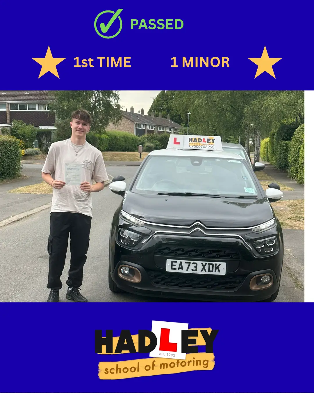 Passed first time with Hadley. From my first lessons back in February, through to passing in August with just 3 minors. I cannot fault Hadley for their professionalism and guidance to their students. My instructor Craig was fantastic. As experienced as they come, being an ex-examiner and knowing all the specific wordings that they use during the practical test really helped. It made me feel so much more confident when my test came around as I knew exactly what to expect. Everything from the app for lesson gaps and driving progress, down to the book they give you on your first lesson. It was all incredibly helpful and made the journey of learning to drive so much better. Extremely grateful to Craig and his patience and confidence in me. Going to miss our lessons together! Thank you so much for everything.