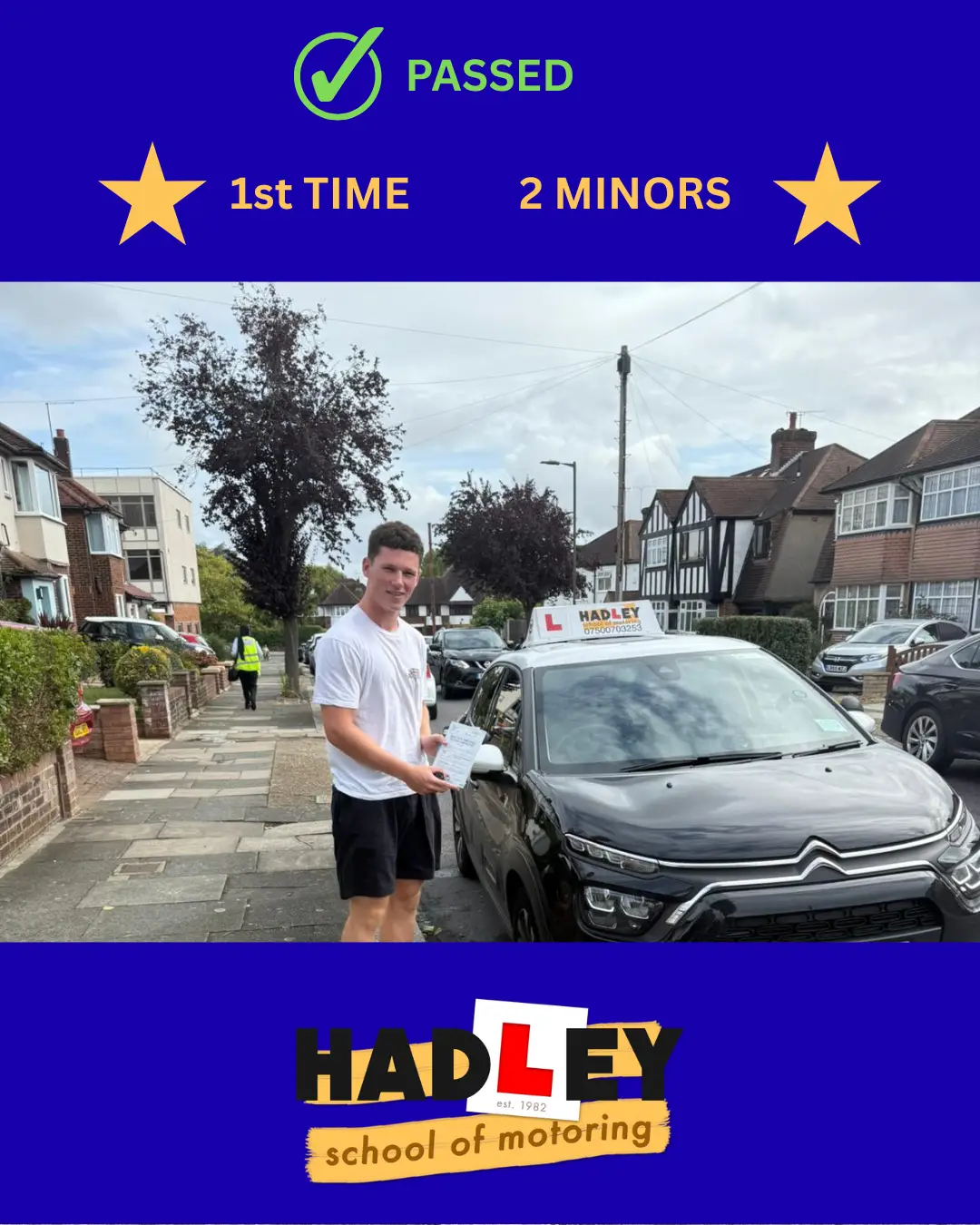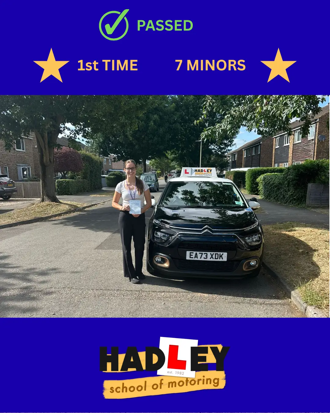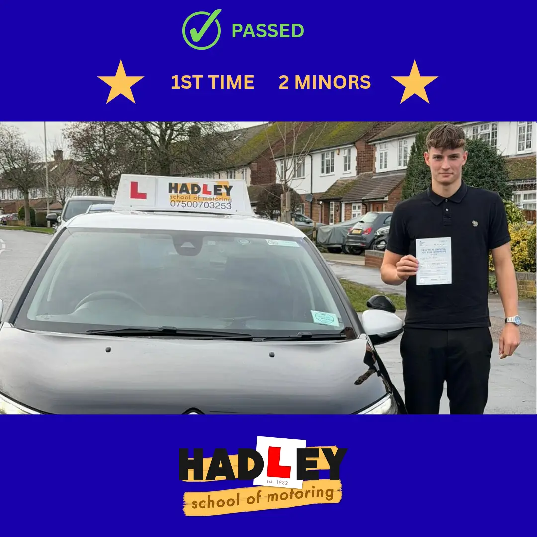 Passed first time with Hadley. From my first lessons back in February, through to passing in August with just 3 minors. I cannot fault Hadley for their professionalism and guidance to their students. My instructor Craig was fantastic. As experienced as they come, being an ex-examiner and knowing all the specific wordings that they use during the practical test really helped. It made me feel so much more confident when my test came around as I knew exactly what to expect. Everything from the app for lesson gaps and driving progress, down to the book they give you on your first lesson. It was all incredibly helpful and made the journey of learning to drive so much better. Extremely grateful to Craig and his patience and confidence in me. Going to miss our lessons together! Thank you so much for everything.