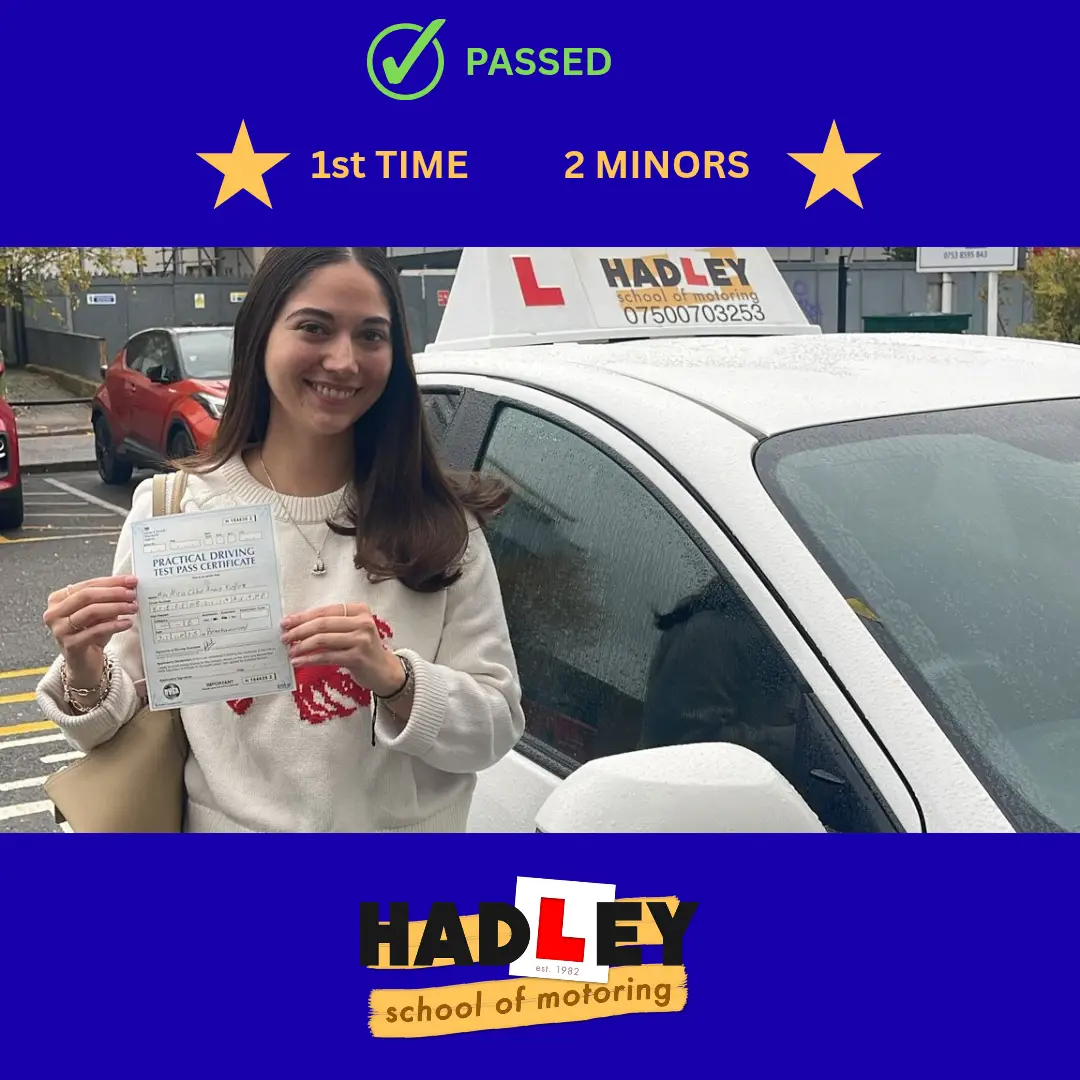 Paul was absolutely amazing as a driving instructor. He helped build my confidence behind the wheel from day one, and I'm so grateful for his encouraging teaching style. Thanks to Paul's guidance, I passed first time with only 3 minors. I would highly recommend Hadley School of Motoring