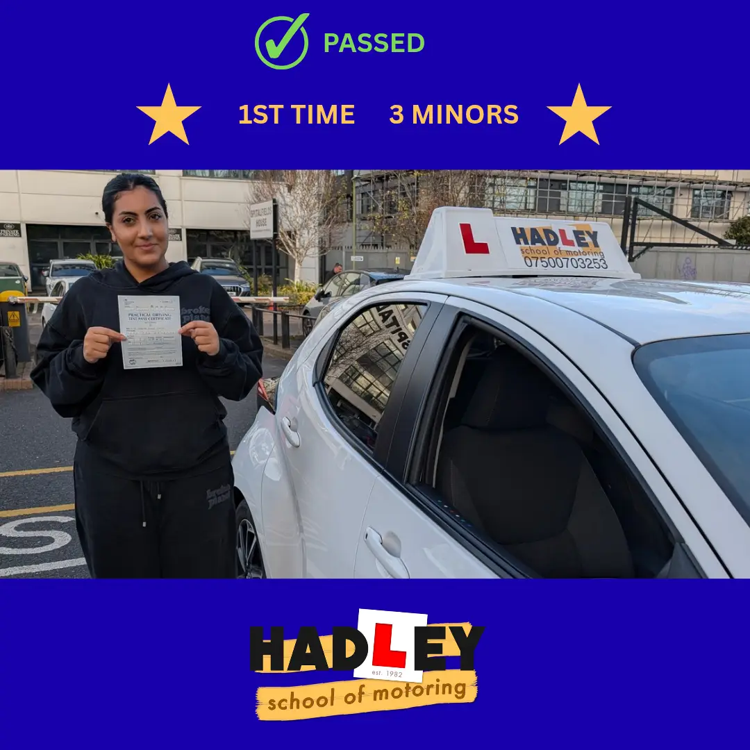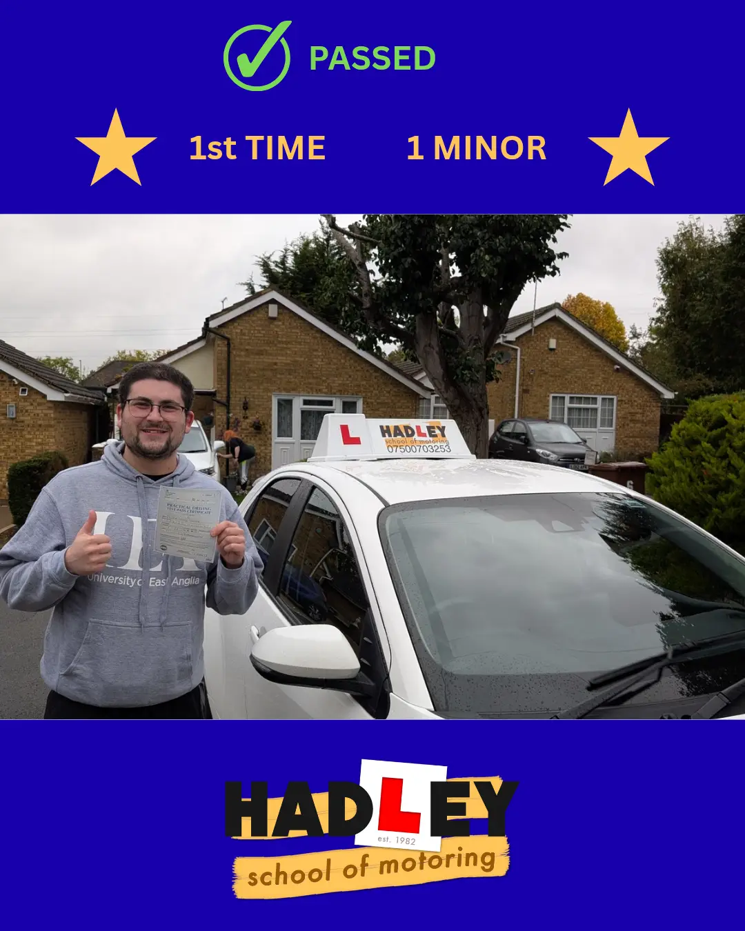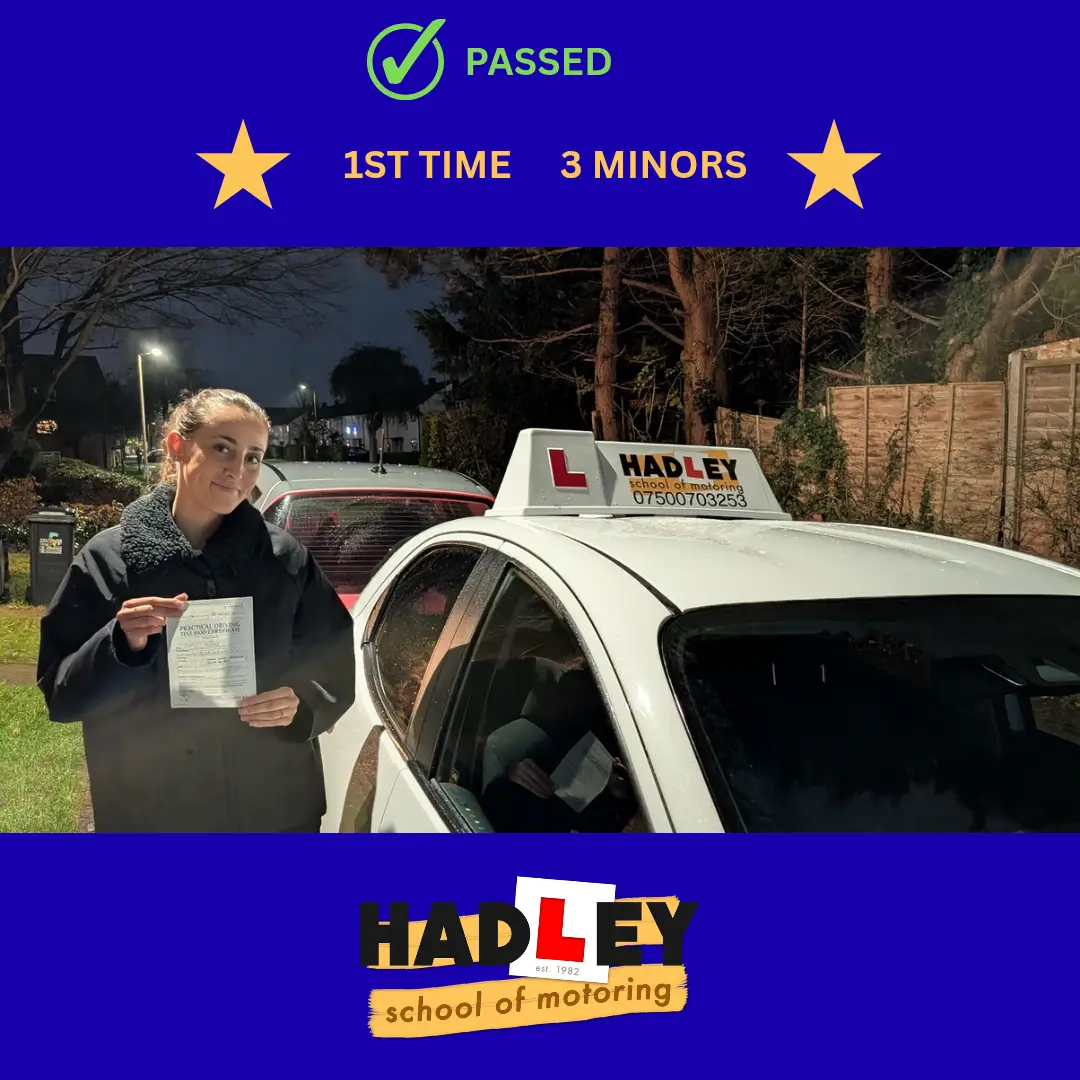 I genuinely cannot thank Hadley School of Motoring - and especially Paul - enough for helping me pass my driving test first time with only one minor!