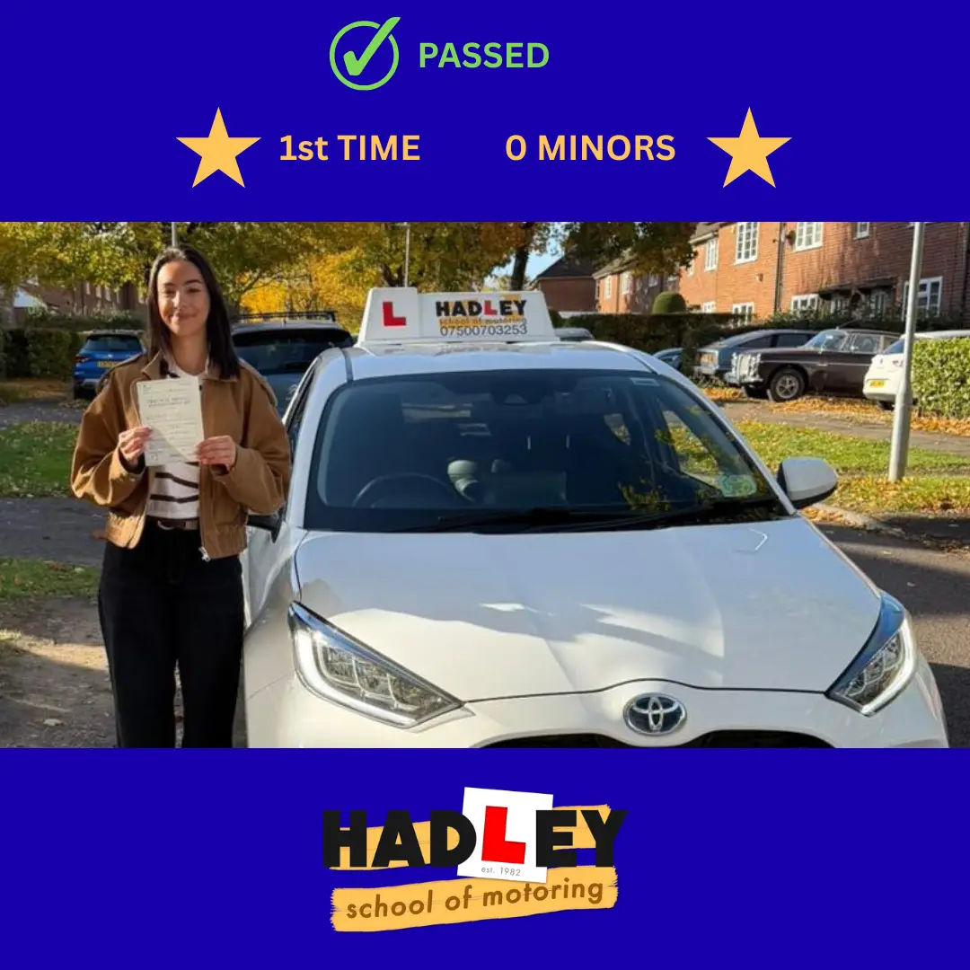 Massive thank you to Paul and Hadley School of Motoring. Not only was every lesson productive and educational but it was also enjoyable and good for my mental health weekly. I passed my test first time thanks to Paul, I passed my theory as well thanks to the theory class I took with Hadley School of Motoring. Going with Hadley School of Motoring really boosted my confidence. In every aspect I would recommend Hadley School of Motoring to anyone! Thank you for the start of my driving journey and making it an enjoyable one.